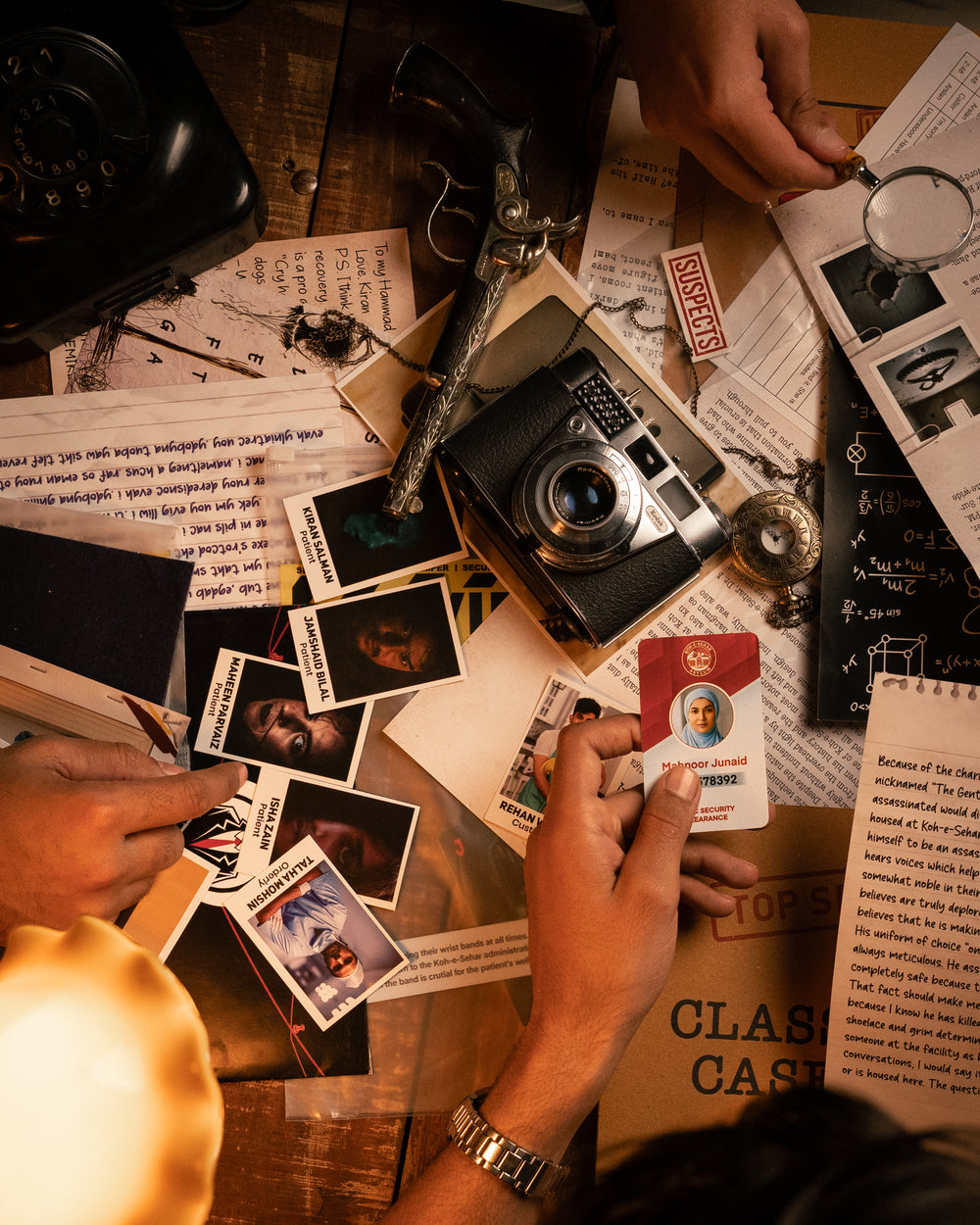 You open the envelope. Photos, notes, and tickets slide onto the table. It feels like a gift. The mystery starts now.